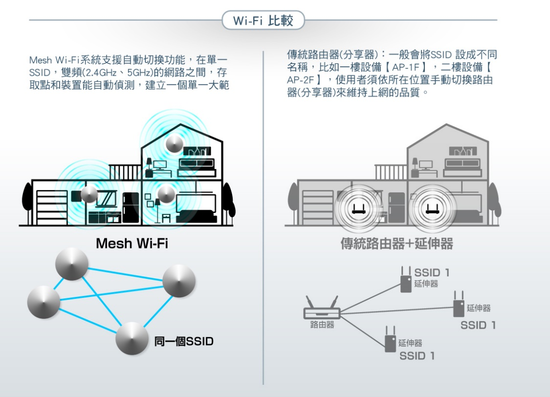 新型「Mesh」網狀架構,延伸WIFI無線訊號,減少訊號干擾