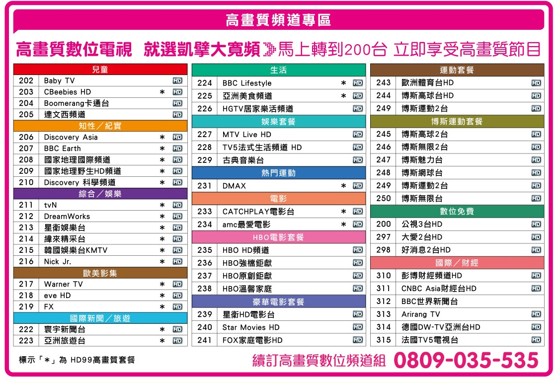 ● 相關服務及收費標準,請參考凱擘大寬頻官網【基本方案收視費】【數位有線電視頻道表】【HD99高畫質套餐】