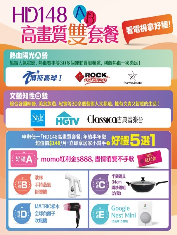 申辦HD148高畫質A/B雙套餐 任一套餐,訂購即送好禮。