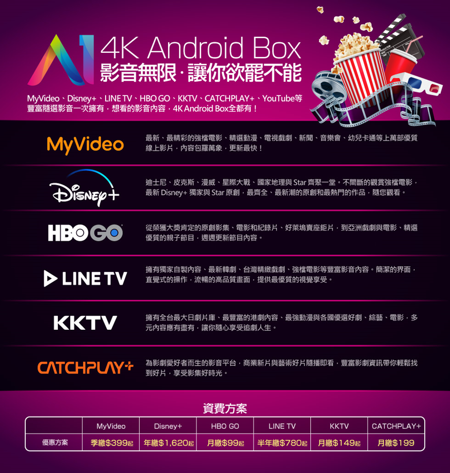 凱擘大寬頻A1 Box搭載4K Android TV為全家人打造智慧家庭生活,整合上百台數位有線電視頻道、多樣節目套餐,也提供Disney+、myVideo、LINE TV、HBO GO、KKTV、CATCHPLAY+等熱門OTT影音內容,電影、戲劇、卡通、動漫隨選隨看,搭配藍牙聲控遙控器,透過聲控調音量、轉頻道、搜尋節目,更網羅多元的生活APP應用服務,包括Uniigym體感健身、MABOW TV瑪帛電視電話、好課多線上學習、Smarter Home等等,創造前所未有的家庭視聽娛樂饗宴和聯網應用服務體驗。